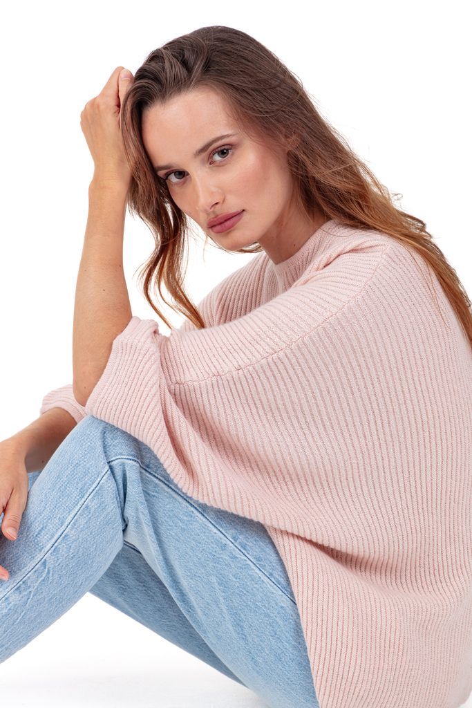 This alpaca poncho jumper pairs perfectly with leggings or slim trousers to balance the volume. With its oversized style, it creates a modern, elegant silhouette, ideal for year-round wear.